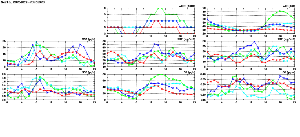 | Air Quality Data Time Series in North (2025/10/20) | ( Line colors: Day -3 Day -2 Day -1 Current day ) | 2D Map Current AQHI |