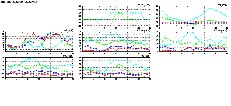 | Air Quality Data Time Series in Sha Tin (2025/10/22) | ( Line colors: Day -3 Day -2 Day -1 Current day ) | 2D Map Current AQHI |