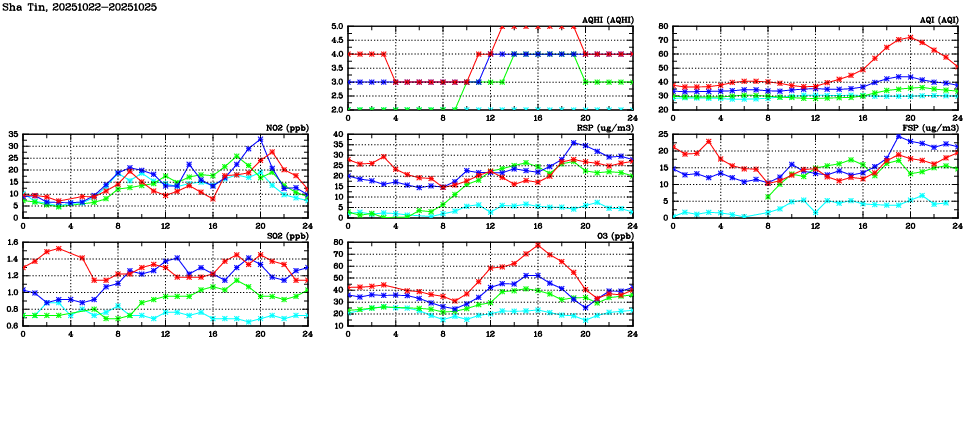| Air Quality Data Time Series in Sha Tin (2025/10/25) | ( Line colors: Day -3 Day -2 Day -1 Current day ) | 2D Map Current AQHI |