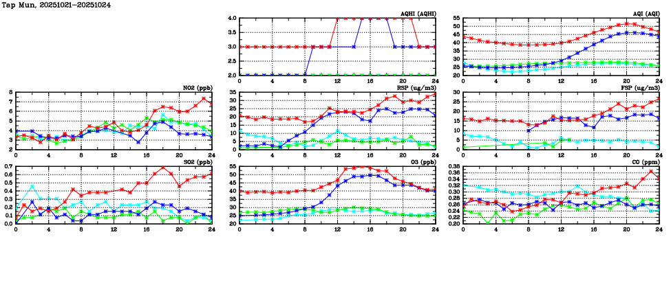 | Air Quality Data Time Series in Tap Mun (2025/10/24) | ( Line colors: Day -3 Day -2 Day -1 Current day ) | 2D Map Current AQHI |