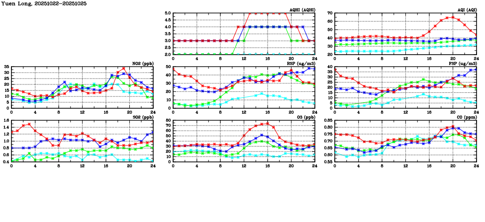 | Air Quality Data Time Series in Yuen Long (2025/10/25) | ( Line colors: Day -3 Day -2 Day -1 Current day ) | 2D Map Current AQHI |
