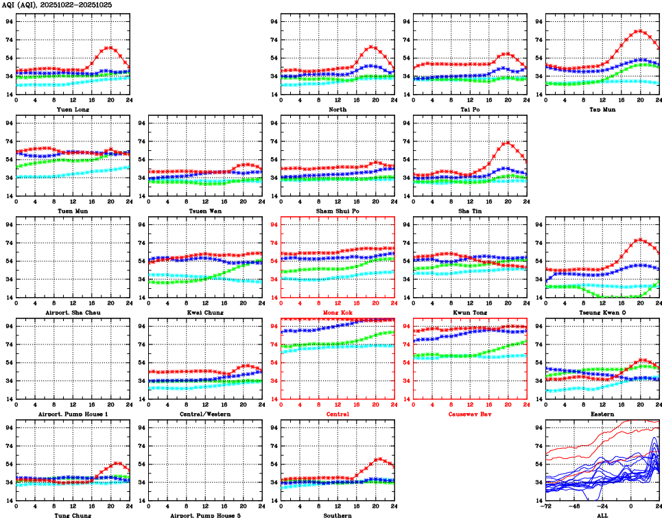| Air Quality Data Time Series for AQI (2025/10/25) | ( Line colors: Day -3 Day -2 Day -1 Current day ) | 2D Map Current AQHI |