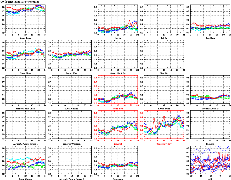 | Air Quality Data Time Series for CO (2025/10/25) | ( Line colors: Day -3 Day -2 Day -1 Current day ) | 2D Map Current AQHI |