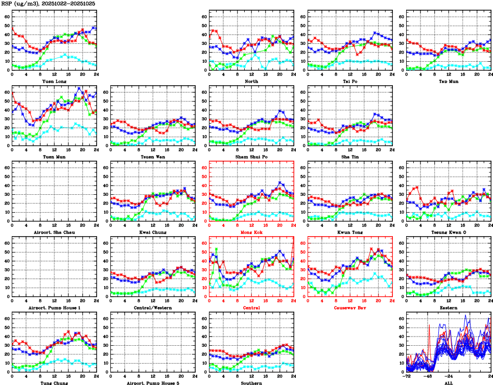 | Air Quality Data Time Series for RSP (2025/10/25) | ( Line colors: Day -3 Day -2 Day -1 Current day ) | 2D Map Current AQHI |
