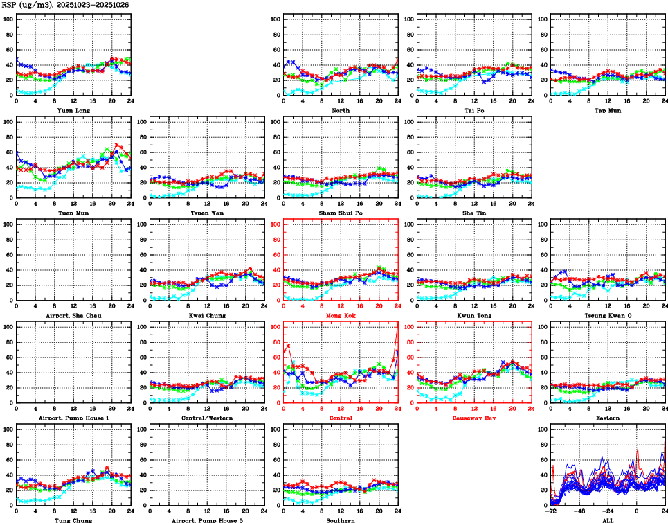 | Air Quality Data Time Series for RSP (2025/10/26) | ( Line colors: Day -3 Day -2 Day -1 Current day ) | 2D Map Current AQHI |