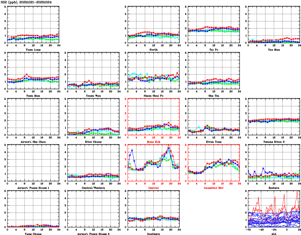 | Air Quality Data Time Series for SO2 (2025/10/24) | ( Line colors: Day -3 Day -2 Day -1 Current day ) | 2D Map Current AQHI |