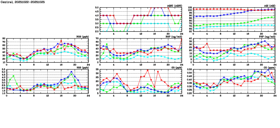 | Air Quality Data Time Series in Central (2025/10/25) | ( Line colors: Day -3 Day -2 Day -1 Current day ) | 2D Map Current AQHI |