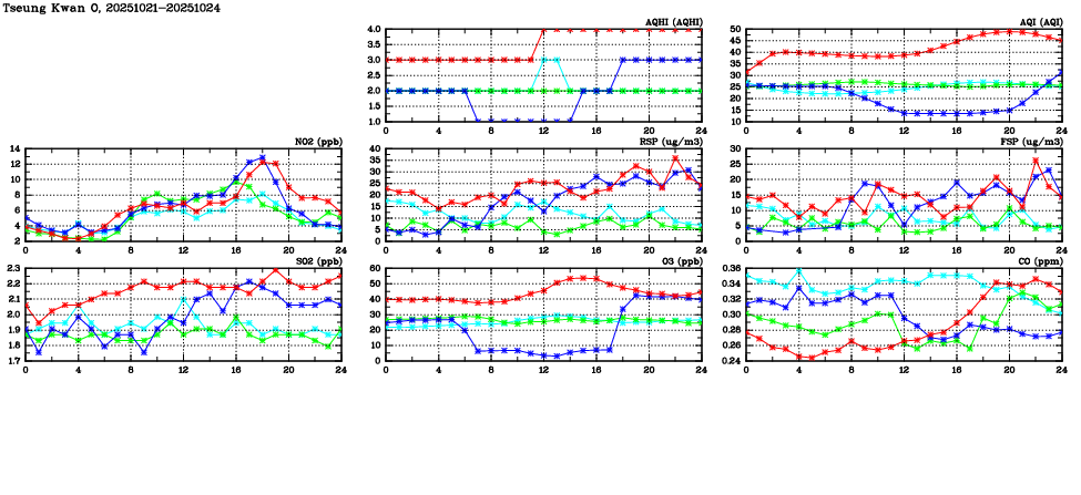 | Air Quality Data Time Series in Tseung Kwan O (2025/10/24) | ( Line colors: Day -3 Day -2 Day -1 Current day ) | 2D Map Current AQHI |