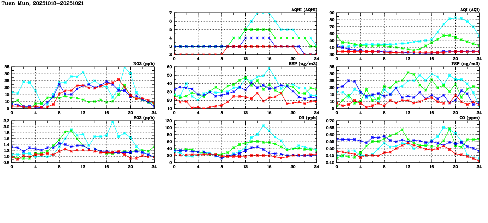 | Air Quality Data Time Series in Tuen Mun (2025/10/21) | ( Line colors: Day -3 Day -2 Day -1 Current day ) | 2D Map Current AQHI |