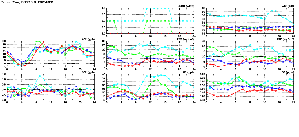 | Air Quality Data Time Series in Tsuen Wan (2025/10/22) | ( Line colors: Day -3 Day -2 Day -1 Current day ) | 2D Map Current AQHI |