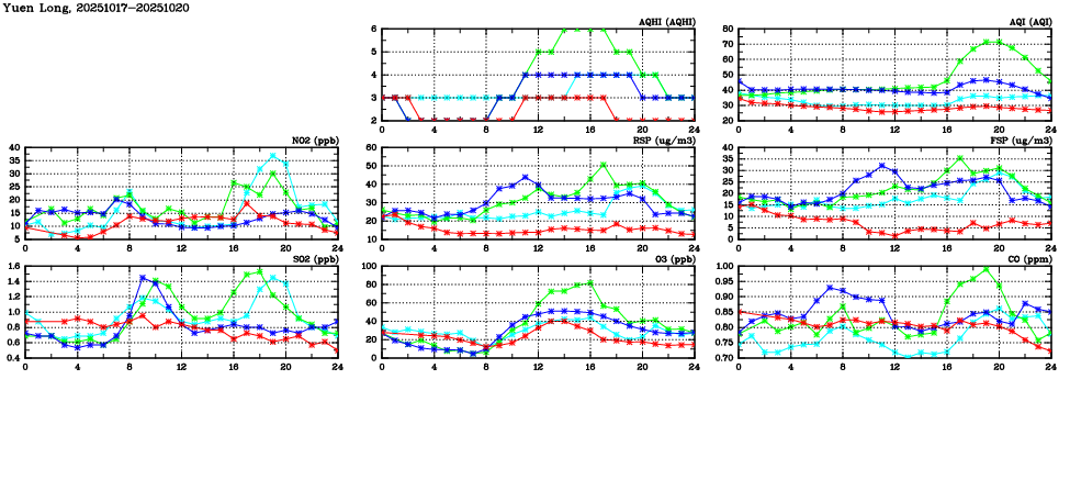 | Air Quality Data Time Series in Yuen Long (2025/10/20) | ( Line colors: Day -3 Day -2 Day -1 Current day ) | 2D Map Current AQHI |