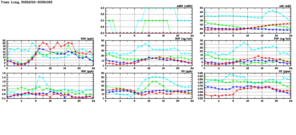 | Air Quality Data Time Series in Yuen Long (2025/10/22) | ( Line colors: Day -3 Day -2 Day -1 Current day ) | 2D Map Current AQHI |