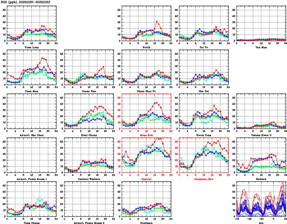 | Air Quality Data Time Series for NO2 (2025/10/23) | ( Line colors: Day -3 Day -2 Day -1 Current day ) | 2D Map Current AQHI |