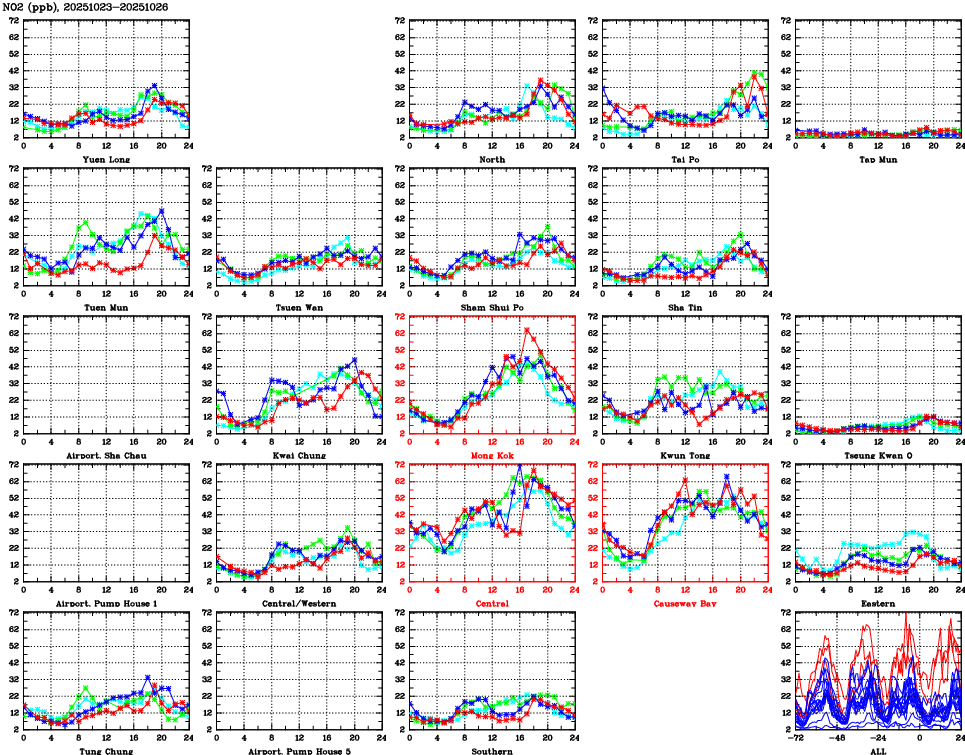 | Air Quality Data Time Series for NO2 (2025/10/26) | ( Line colors: Day -3 Day -2 Day -1 Current day ) | 2D Map Current AQHI |