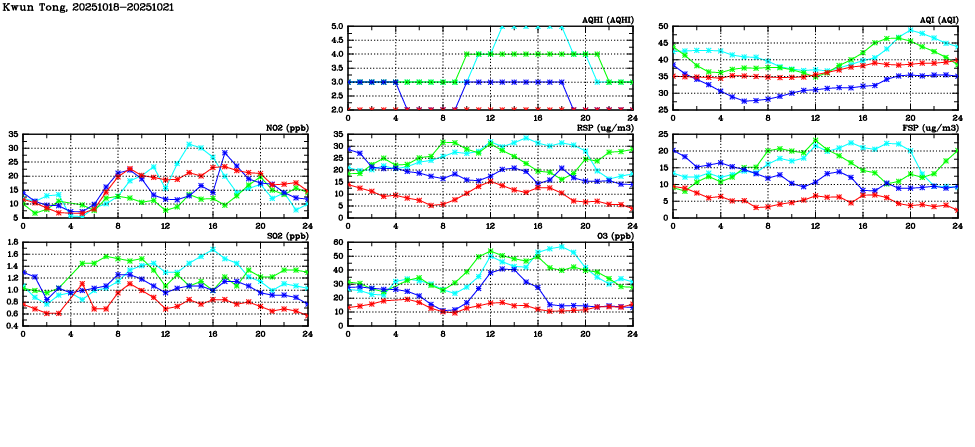 | Air Quality Data Time Series in Kwun Tong (2025/10/21) | ( Line colors: Day -3 Day -2 Day -1 Current day ) | 2D Map Current AQHI |