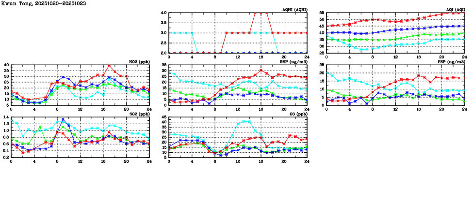 | Air Quality Data Time Series in Kwun Tong (2025/10/23) | ( Line colors: Day -3 Day -2 Day -1 Current day ) | 2D Map Current AQHI |