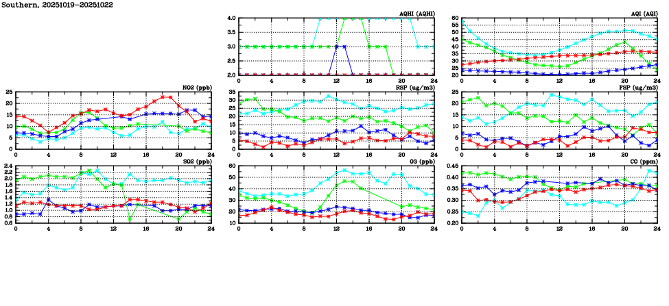 | Air Quality Data Time Series in Southern (2025/10/22) | ( Line colors: Day -3 Day -2 Day -1 Current day ) | 2D Map Current AQHI |