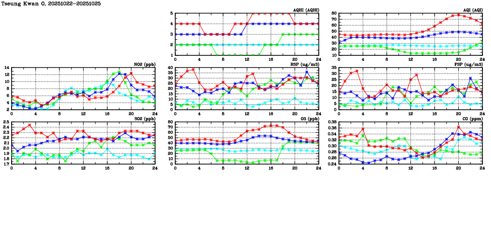 | Air Quality Data Time Series in Tseung Kwan O (2025/10/25) | ( Line colors: Day -3 Day -2 Day -1 Current day ) | 2D Map Current AQHI |