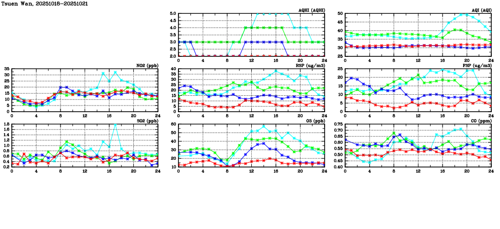 | Air Quality Data Time Series in Tsuen Wan (2025/10/21) | ( Line colors: Day -3 Day -2 Day -1 Current day ) | 2D Map Current AQHI |