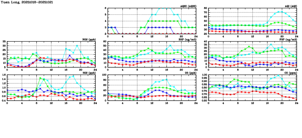 | Air Quality Data Time Series in Yuen Long (2025/10/21) | ( Line colors: Day -3 Day -2 Day -1 Current day ) | 2D Map Current AQHI |