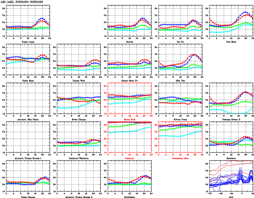 | Air Quality Data Time Series for AQI (2025/10/26) | ( Line colors: Day -3 Day -2 Day -1 Current day ) | 2D Map Current AQHI |