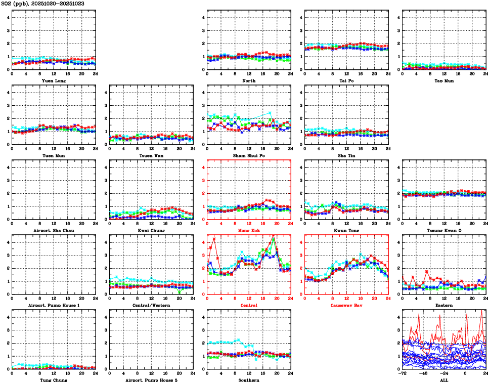 | Air Quality Data Time Series for SO2 (2025/10/23) | ( Line colors: Day -3 Day -2 Day -1 Current day ) | 2D Map Current AQHI |