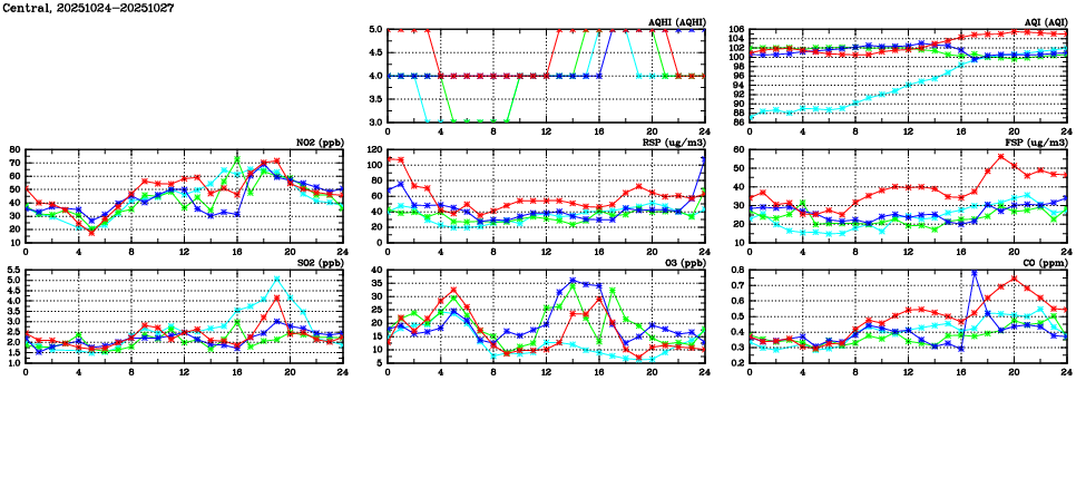 | Air Quality Data Time Series in Central (2025/10/27) | ( Line colors: Day -3 Day -2 Day -1 Current day ) | 2D Map Current AQHI |