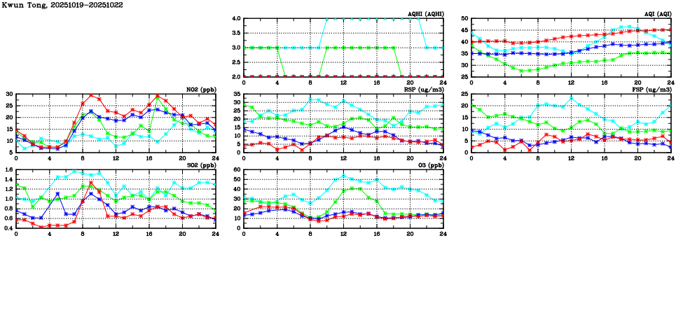 | Air Quality Data Time Series in Kwun Tong (2025/10/22) | ( Line colors: Day -3 Day -2 Day -1 Current day ) | 2D Map Current AQHI |