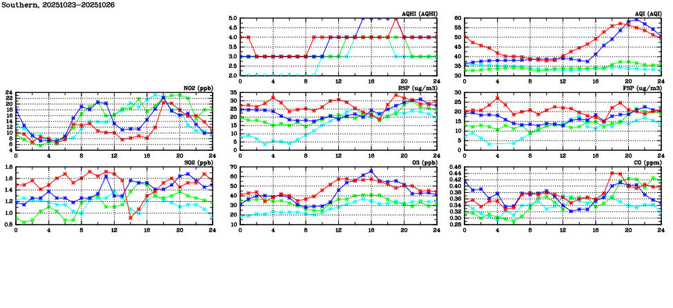 | Air Quality Data Time Series in Southern (2025/10/26) | ( Line colors: Day -3 Day -2 Day -1 Current day ) | 2D Map Current AQHI |