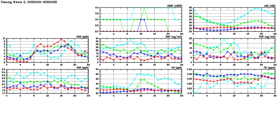 | Air Quality Data Time Series in Tseung Kwan O (2025/10/22) | ( Line colors: Day -3 Day -2 Day -1 Current day ) | 2D Map Current AQHI |