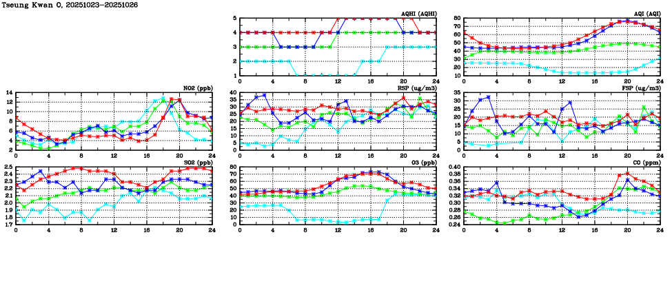 | Air Quality Data Time Series in Tseung Kwan O (2025/10/26) | ( Line colors: Day -3 Day -2 Day -1 Current day ) | 2D Map Current AQHI |