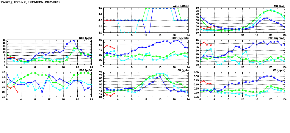 | Air Quality Data Time Series in Tseung Kwan O (2025/10/28) | ( Line colors: Day -3 Day -2 Day -1 Current day ) | 2D Map Current AQHI |