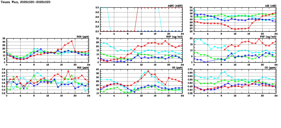 | Air Quality Data Time Series in Tsuen Wan (2025/10/23) | ( Line colors: Day -3 Day -2 Day -1 Current day ) | 2D Map Current AQHI |