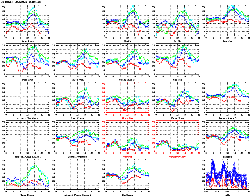 | Air Quality Data Time Series for O3 (2025/10/28) | ( Line colors: Day -3 Day -2 Day -1 Current day ) | 2D Map Current AQHI |