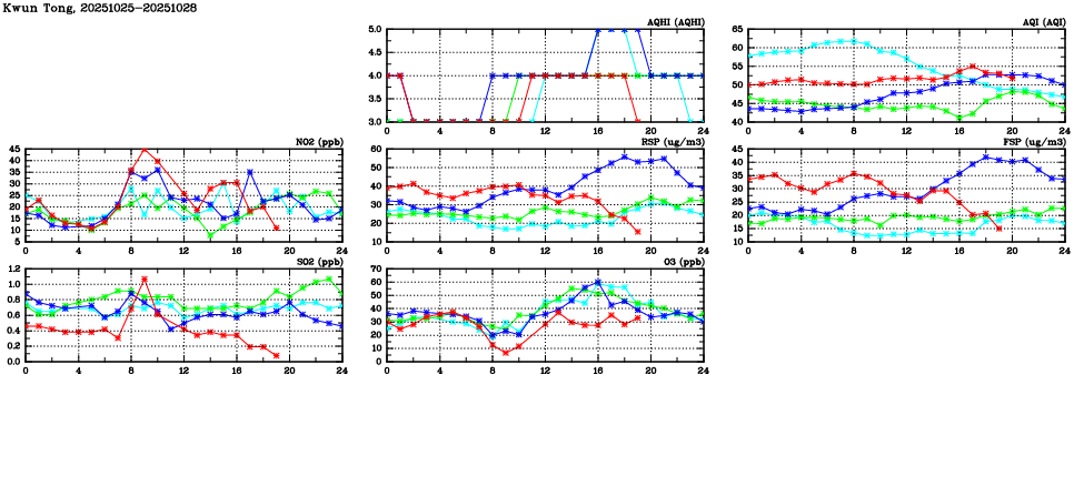 | Air Quality Data Time Series in Kwun Tong (2025/10/28) | ( Line colors: Day -3 Day -2 Day -1 Current day ) | 2D Map Current AQHI |