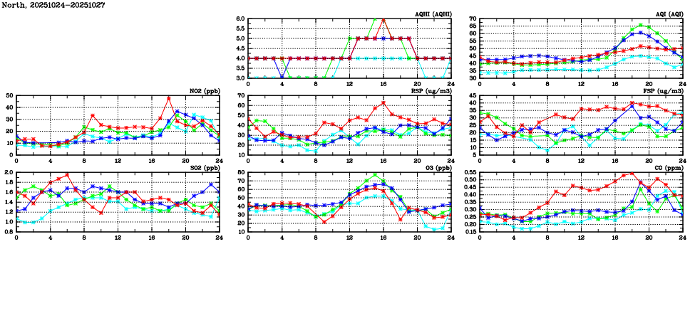 | Air Quality Data Time Series in North (2025/10/27) | ( Line colors: Day -3 Day -2 Day -1 Current day ) | 2D Map Current AQHI |