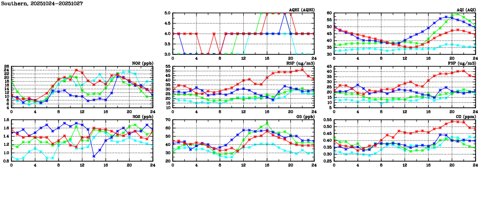 | Air Quality Data Time Series in Southern (2025/10/27) | ( Line colors: Day -3 Day -2 Day -1 Current day ) | 2D Map Current AQHI |