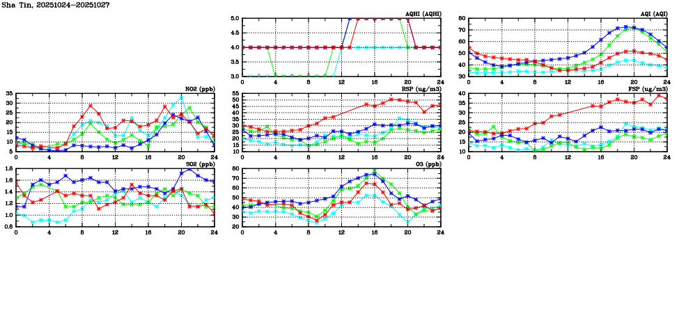 | Air Quality Data Time Series in Sha Tin (2025/10/27) | ( Line colors: Day -3 Day -2 Day -1 Current day ) | 2D Map Current AQHI |