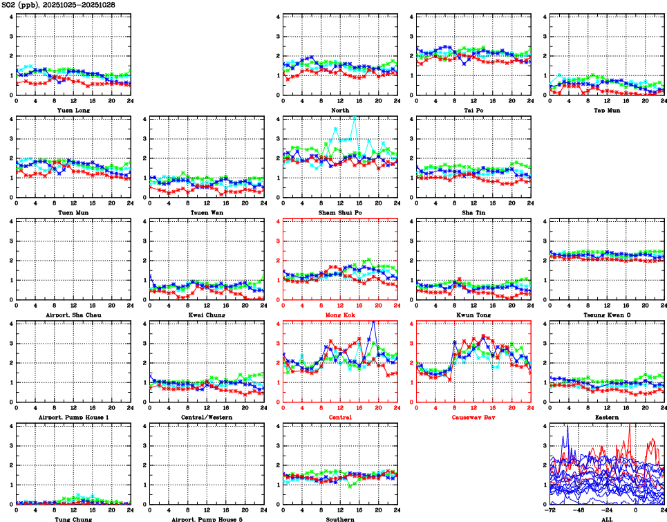 | Air Quality Data Time Series for SO2 (2025/10/28) | ( Line colors: Day -3 Day -2 Day -1 Current day ) | 2D Map Current AQHI |