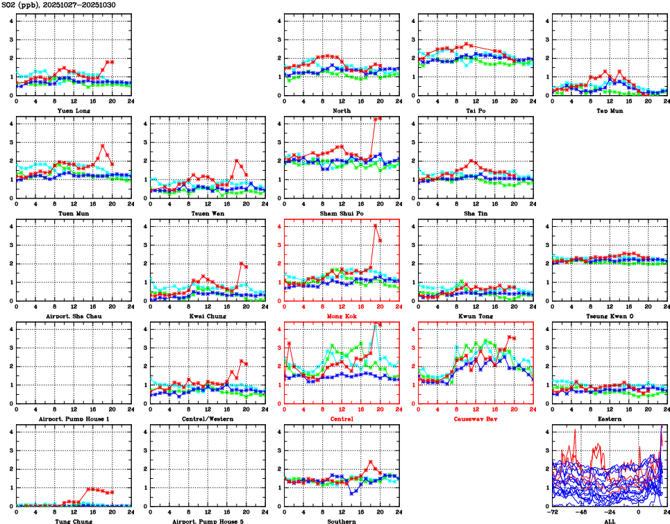 | Air Quality Data Time Series for SO2 (2025/10/30) | ( Line colors: Day -3 Day -2 Day -1 Current day ) | 2D Map Current AQHI |