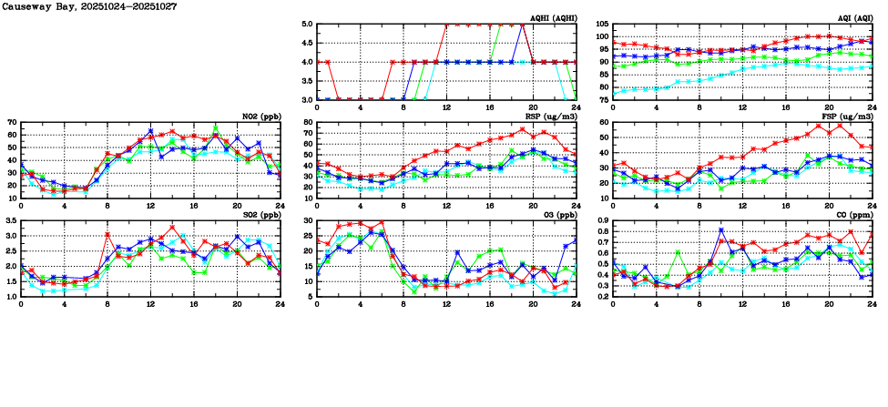 | Air Quality Data Time Series in Causeway Bay (2025/10/27) | ( Line colors: Day -3 Day -2 Day -1 Current day ) | 2D Map Current AQHI |