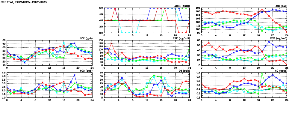 | Air Quality Data Time Series in Central (2025/10/28) | ( Line colors: Day -3 Day -2 Day -1 Current day ) | 2D Map Current AQHI |