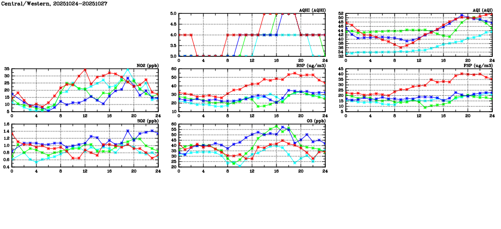 | Air Quality Data Time Series in Central/Western (2025/10/27) | ( Line colors: Day -3 Day -2 Day -1 Current day ) | 2D Map Current AQHI |