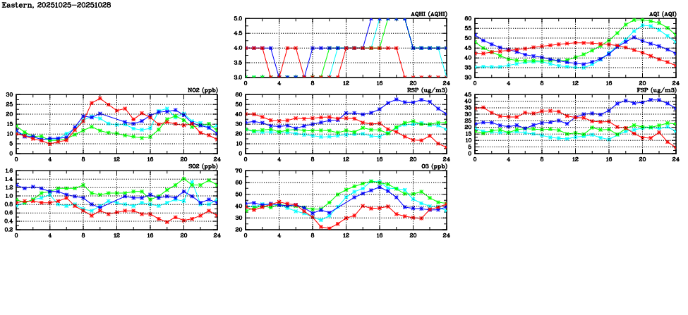| Air Quality Data Time Series in Eastern (2025/10/28) | ( Line colors: Day -3 Day -2 Day -1 Current day ) | 2D Map Current AQHI |