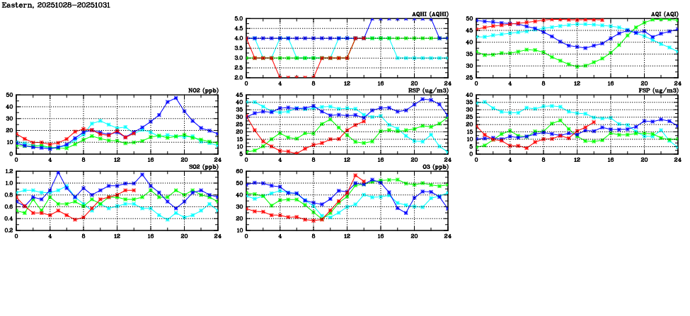 | Air Quality Data Time Series in Eastern (2025/10/31) | ( Line colors: Day -3 Day -2 Day -1 Current day ) | 2D Map Current AQHI |