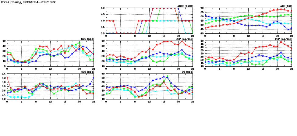 | Air Quality Data Time Series in Kwai Chung (2025/10/27) | ( Line colors: Day -3 Day -2 Day -1 Current day ) | 2D Map Current AQHI |