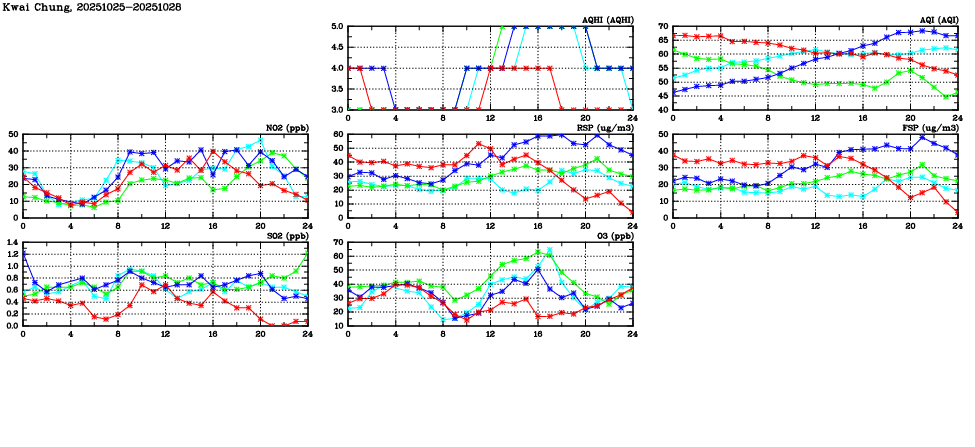 | Air Quality Data Time Series in Kwai Chung (2025/10/28) | ( Line colors: Day -3 Day -2 Day -1 Current day ) | 2D Map Current AQHI |