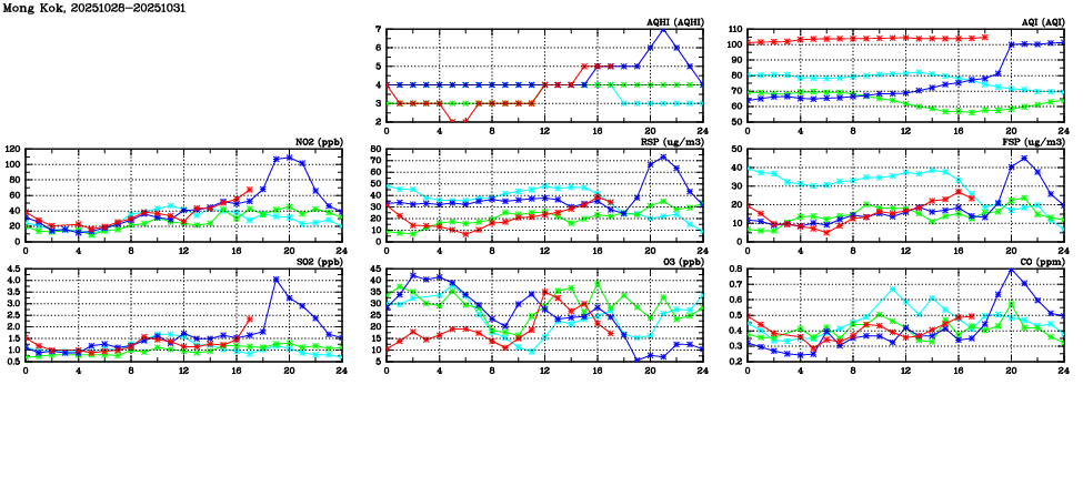 | Air Quality Data Time Series in Mong Kok (2025/10/31) | ( Line colors: Day -3 Day -2 Day -1 Current day ) | 2D Map Current AQHI |