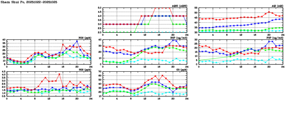 | Air Quality Data Time Series in Sham Shui Po (2025/10/25) | ( Line colors: Day -3 Day -2 Day -1 Current day ) | 2D Map Current AQHI |