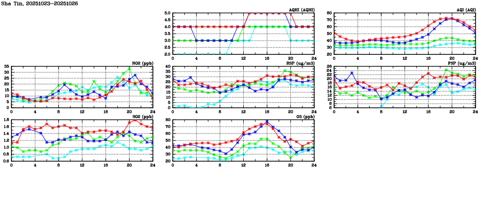 | Air Quality Data Time Series in Sha Tin (2025/10/26) | ( Line colors: Day -3 Day -2 Day -1 Current day ) | 2D Map Current AQHI |